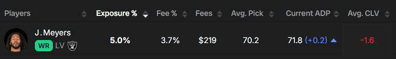 I’ve found Meyers’ price in drafts puzzling all year, with the impending target squeeze on tap and have only selected him in 5% of my drafts, as you can see from the Best Ball Hub: