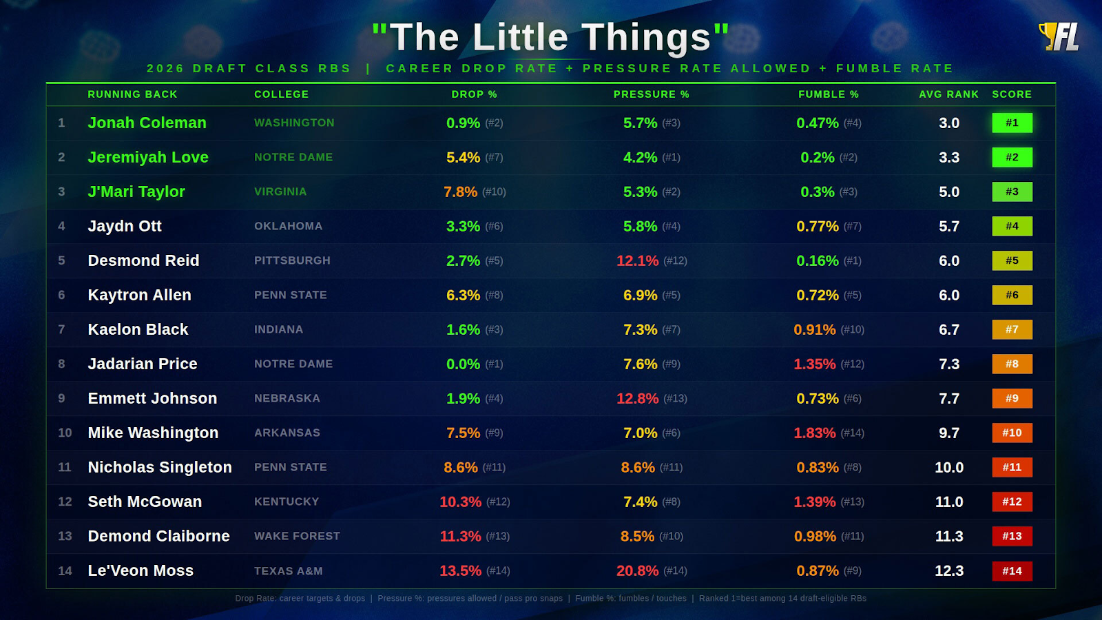 We can get a decent idea of how incoming running backs perform in these areas with a handy-dandy formula I made up after consuming a few delicious Mike's Hard Lemonades called "The Little Things." This takes the average rank from every RB's career drop rate, pressure rate allowed and fumble rate.