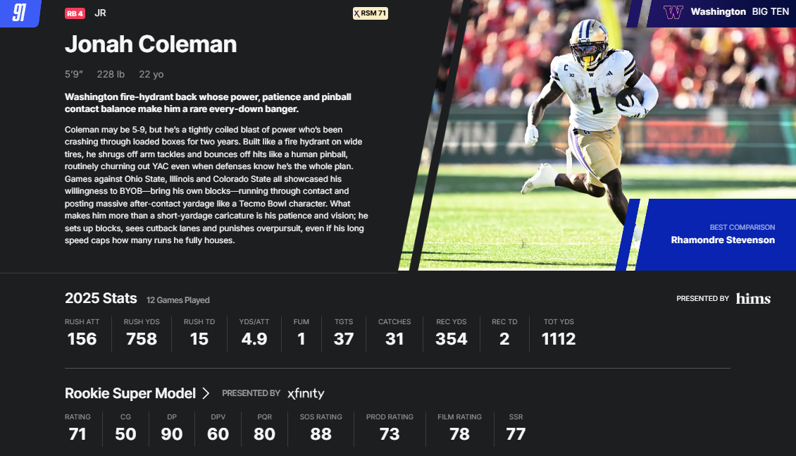 The Washington product racked up nearly 4,000 total yards from scrimmage and scored 37 times in four seasons of college ball, rarely having any issues with ball security or pass protection along the way. Hell, the man took out likely top-10 pick Sonny Styles! This all makes more sense when you realize Coleman is built like a brick house: At 5-foot-8, 220 pounds, he has a BMI in the 97th percentile among running backs!
